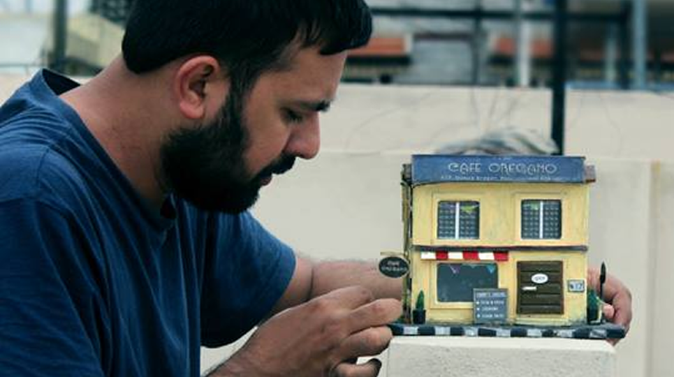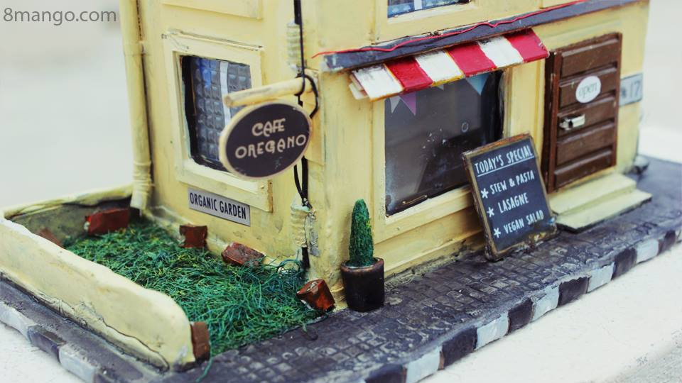 This miniature is crafted from memories and materials that once had another life. Broken glass becomes reflective windows that catch light like afternoon sun on colonial facades. Discarded colour tubes, wooden fragments, and found objects come together to recreate a café that feels lived-in familiar, welcoming, and gently imperfect.