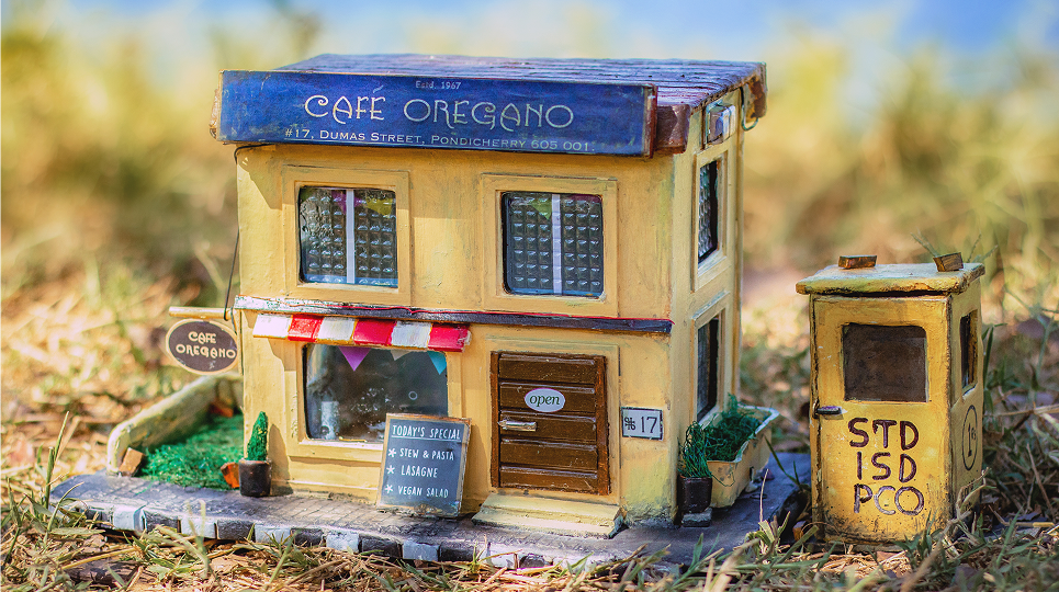 Every detail is intentional. The hand-painted façade carries the softness of weathered walls you’d find walking through Pondicherry’s narrow streets. Standing beside the café is a humble STD/ISD/PCO booth a detail that elevates the narrative. Placed next to Café Oregano, it becomes a quiet reminder of conversations that mattered, of voices traveling distances before smartphones existed. It complements the café perfectly two relics of shared human experience, frozen in miniature form. It celebrates slow living, forgotten objects, and the beauty that emerges when waste is reimagined with care.