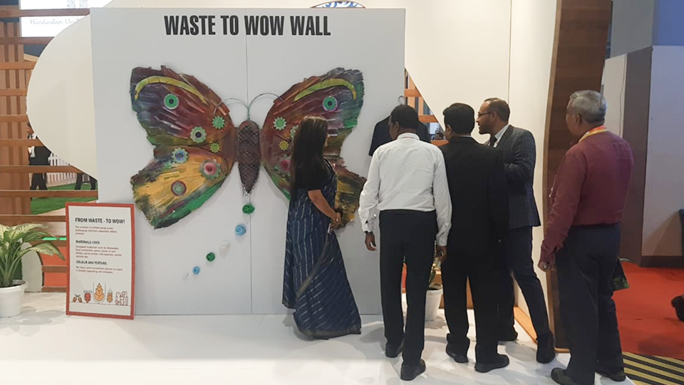 The global event turned out be a canvas for sustainable storytelling through a signature artefact crafted entirely from everyday waste – disposable food containers, peel-off soft drink labels, carton boxes, milk packets and plastic spoons that would otherwise end up in landfills. Each discarded element was carefully reimagined and assembled, proving that waste can be transformed into meaningful design. The art-installation was also acknowledged by our Honourable Prime Minister.