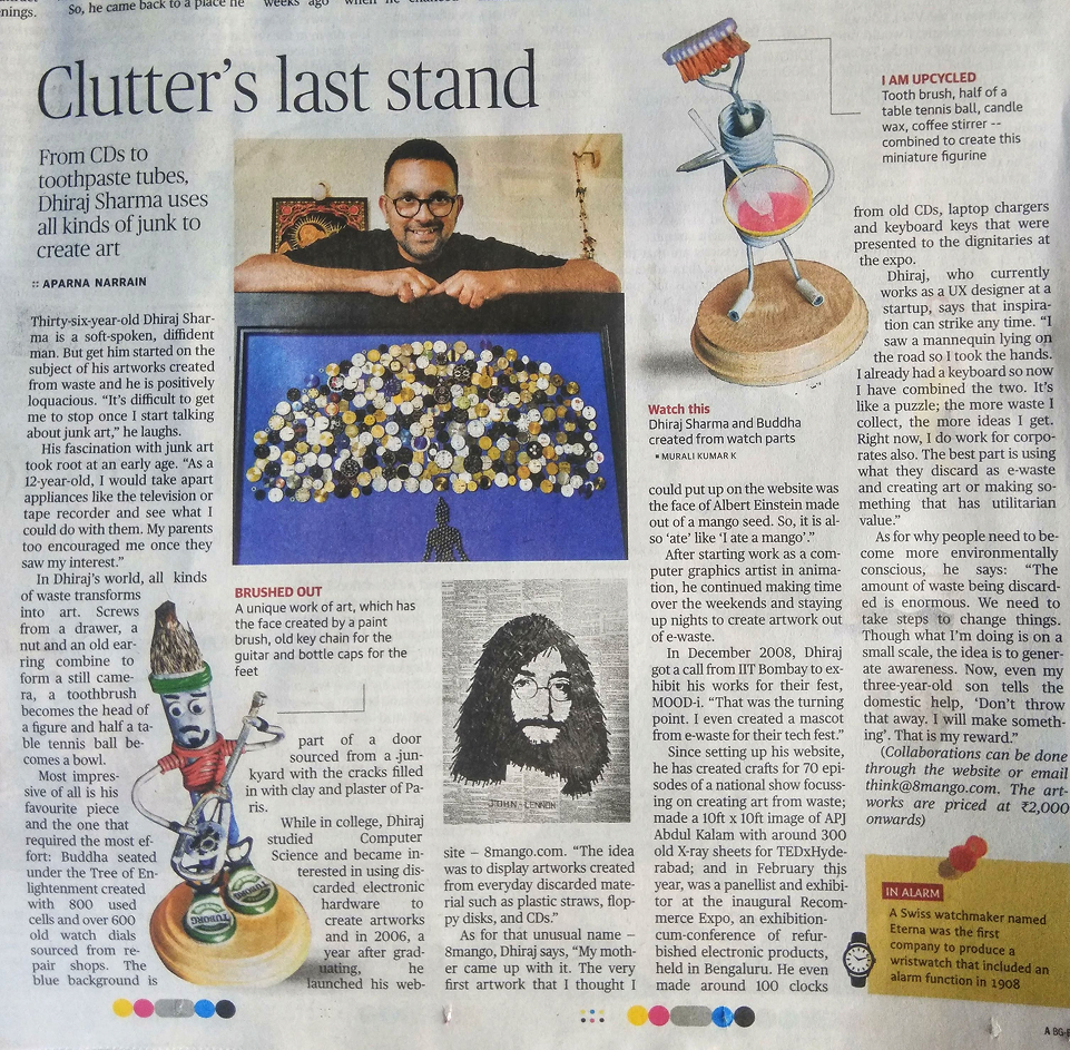 More than 600 watch parts used in the making of the  artefact. Comprising more than 100 odd brands, some  genuine some duplicate. All these junk collected from six  watch repairing stores, falling within the radius of 5 KM.  What are the odds, that 600 people have known or met each  other and where are they now ? Did these people ever shake  hands?