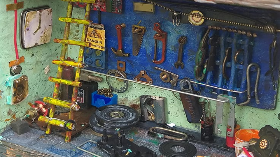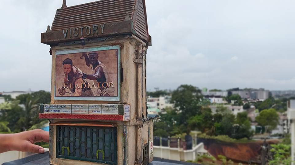 Inspired by the heritage Victory Talkies located in Pune, East Street. The artwork holds a special memories of watching some amazing films back in late 90s to early 2000. It took me about 7 months to complete this. The movie poster on the facade was done back in 2002 in MS Paint. The miniature is made using more than hundred small pieces of discarded parts that I could gaze in my junk-repository.